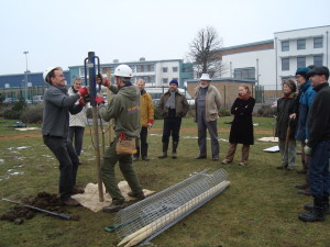 Once Lewis had shown them how, well wrapped up volunteers from Mill Hill Park Residents’ Association (MHPRA), Ealing Transition, worked with pickaxes and spades, alongside others to break through the crust of frozen ground, dig square holes – round ones are bad for the roots – to plant apple, pear, and plum trees, an apricot and a medlar. ‘Planting the trees was the easy bit!’ said Ray Batchelor, Chair, MHPRA, ‘Driving stakes in for protective wire mesh – that was really hard.’