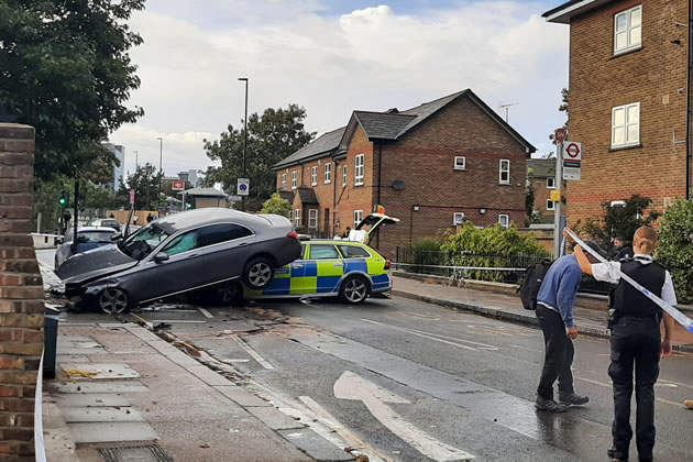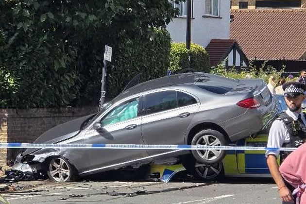 The force of the contact, which took place shortly after midday on Boston Manor Road, was enough to force the Met’s vehicle under a large silver Mercedes saloon.