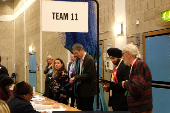 Daniel Goldsmith of the Green Party (middle) watches the count