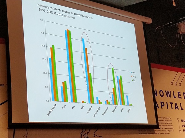 People cycling to work have gone up fourfold in 20 years and are now way ahead of (in a number of ways) people who drive. Food for thought, huh?