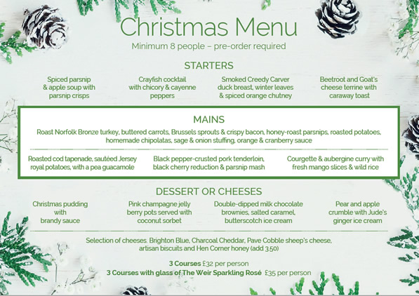 Enjoy exclusive use of our waterside dining room or private bar areas at The Weir for your Christmas social event. Tuck into our traditional Christmas menu , sharing menu or buffet party menus. Click here to download our easy to use pre-order sheet. Our in-house event management team are ready to help.