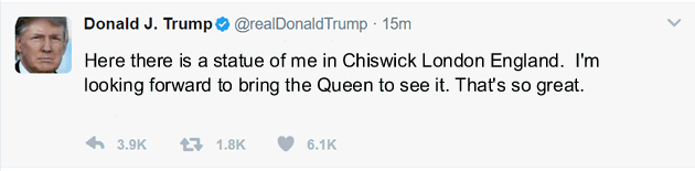In a chain of events which at this point remain difficult to explain, the President of the United States, Donald Trump appears to have mistakenly gained the impression that a statue has been erected in his honour on Chiswick High Road. British diplomats deny telling him that this was the case but a formal request has now been made by the American State Department for a visit to the statue to form part of the President’s planned state visit. The Foreign and Commonwealth Office (FCO) are currently negotiating with the American counterparts who have given them a list of requests from Donald Trump about his itinerary during the visit which is now expected to be some time later this year.