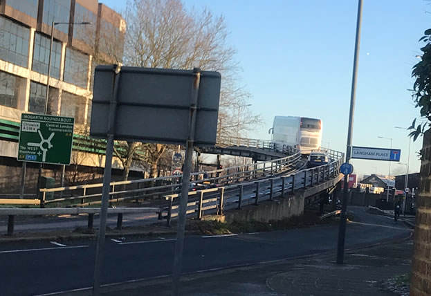 The Hogarth Flyover was meant to be a temporary solution when it was built in the early 1970s but plans for a permanent replacement were shelved and the steel frame bridge remains in place. It has recently been refurbished.
