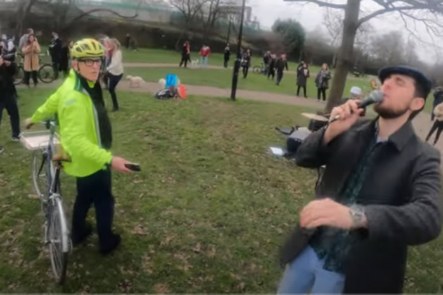 At one point a member of the public, a cyclist in a hi-viz jacket, told them they should leave the park. It is not clear whether he was annoyed about the flouting of lockdown rules or the quality of the singing.
