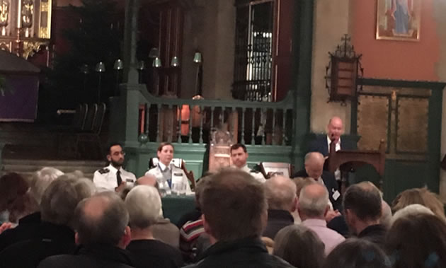 (l-r , Sgt Sharma, Insp Dee O' Brien, Supt Gary Taylor, Torin Douglas speaking)