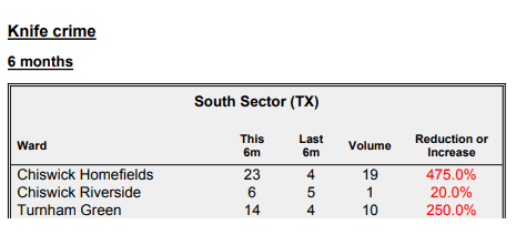The report shows an alarming increase in the amount of knife crime in the W4 area over the latest six months for which figures have been compiled. There were 43 incidents in the period compared with 13 for the previous six months or more than tripling. The worst affected ward was Chiswick Homefields which went from just four cases to 23. The ward seems to also have experienced an increase in drug crime with offences of this kind more than doubling during the period.