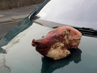 A police spokesman said, "The pig's head was taken by a person or persons attending an event in the street. We believe that the car was chosen at random as it just happened to be parked nearby."