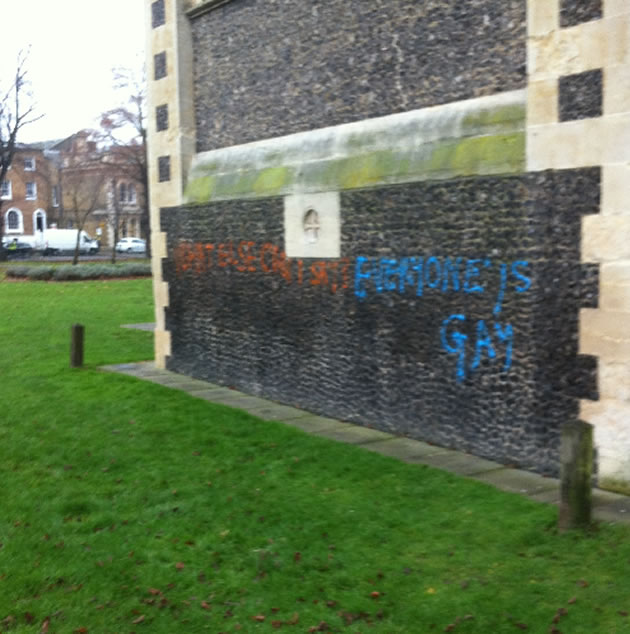 Two sentences appeared on the wall yesterday, one in red paint saying 'What else do I say' and another in blue saying 'Everyone is Gay'.