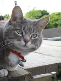 He has a red collar with a bell, a little lucky shell and a small tag that says "Please do not feed me." He is micro-chipped too.