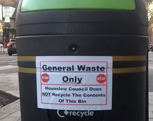 He said that he was told by the workers that rubbish from flats above shops as well as public bins was not being recycled. He then decided to stick labels onto the street bins stating “General Waste only. Hounslow council does not recycle the contents of this bin.”