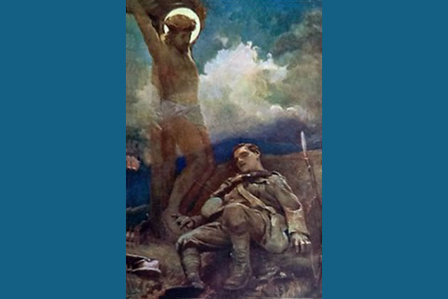The Great Sacrifice depicted a dead soldier in British uniform at the foot of a ghostly figure of Christ on the Cross. It became a popular print and was used as a war memorial in many public buildings and in stained-glass windows. Queen Mary, the wife of King George V, bought the original painting.