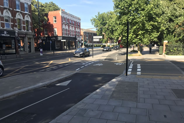 The changes see new light phases in operation at junctions including by Chiswick Lane, bus islands introduced and a redesign of the junctions with side roads to make the presence of the cycle lane more evident. The cycle lane now has buff surfacing across junctions with Homefield Road, Airedale Road and Netheravon Road to alert turning vehicles to presence of cyclists.