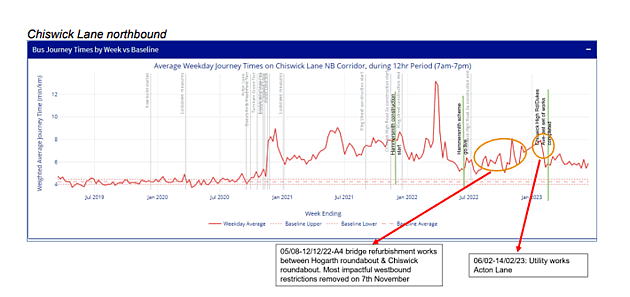 The monitoring report included data on bus times which showed that performance had deteriorated particularly eastbound on the High Road and northbound on Chiswick Lane. The average journey time during the weekday (7am – 7pm) had increased by less than a minute per kilometre eastbound and 1.7 minutes on Chiswick Lane northbound.