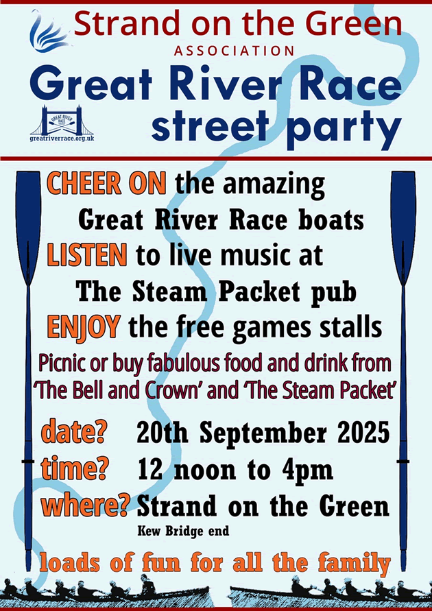 Based at the Kew Bridge end of Strand on the Green from 12 noon to 4pm, there will be live music at the Steam Packet pub and free games stalls as well as the Great River Race itself. Bring a picnic or enjoy some food at the Bell and Crown or the Steam Packet