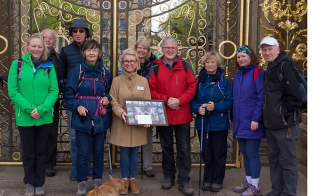 The St Paul’s pilgrims were led by Simon Surtees, currently Reader at the church. “When we realised that Chatsworth was on the route”, he said, “we contacted the Chatsworth Estate. With the Duke of Devonshire’s encouragement, we arranged to present a framed picture of the Church as it is now to Kay Rotchford from his private office at the beginning of the final leg towards Eyam on May 2nd.”