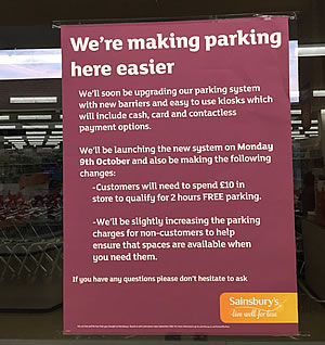 A notice has been posted saying a new system will be imposed which will mean customers will have to spend £10 in store before qualifying for two hours free parking. Until now the charge has been £5 to qualify for validation of the parking card at the checkout.