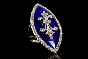 Lot 226. A 19th century, gold / silver, blue enamel and diamond set marquise shaped dress ring. Estimate £1,000 – £1,500