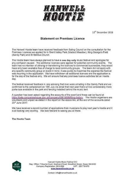 The popular one day annual Hootie which attracts thousands of people to the area will still take place on May 12th 2018, however there was confusion after Hanwell Hootie CIC applied for 3 permanent licenses allowing up to 5 more, 4 day events with music, dance and alcohol.