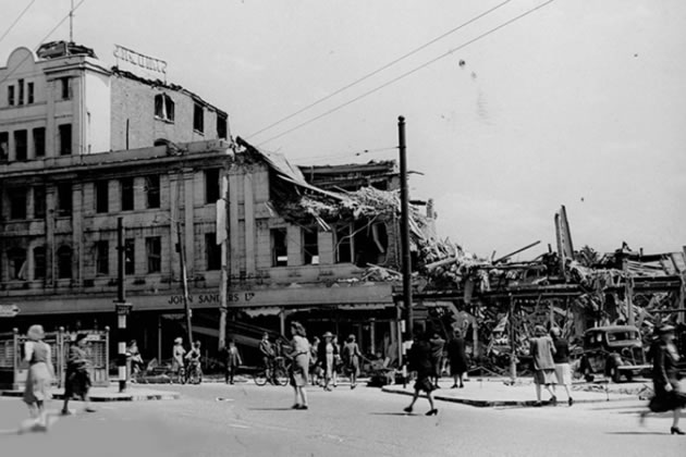 ‘I tried to phone home across road, but it was out of order – so went on cycle to The Avenue & phoned from there. M terribly worried as it looked alright in our direction. Felt rather shaky. Main doors were blown open, & screws drawn out of brass plates. Windows broken, & ceilings down in flats. Men doing rescue work – some dribbled back towards 3.0. Joe very near bomb when it fell on Abernethie & Boots. Although on leave he spent the morning doing very good rescue work & and came in covered with dust. Fire & gas stared there. Awful business. Men saw beastly sights. Leathers couldn’t eat any dinner’.