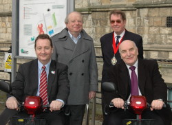 Broadcaster John Sergeant waved the chequered flag to start a scooter race between Steve Pound MSP and Council Leader, Councillor Julian Bell. Deputy Mayor, Councillor John Gallagher also helped with starting duties (pictured below right).