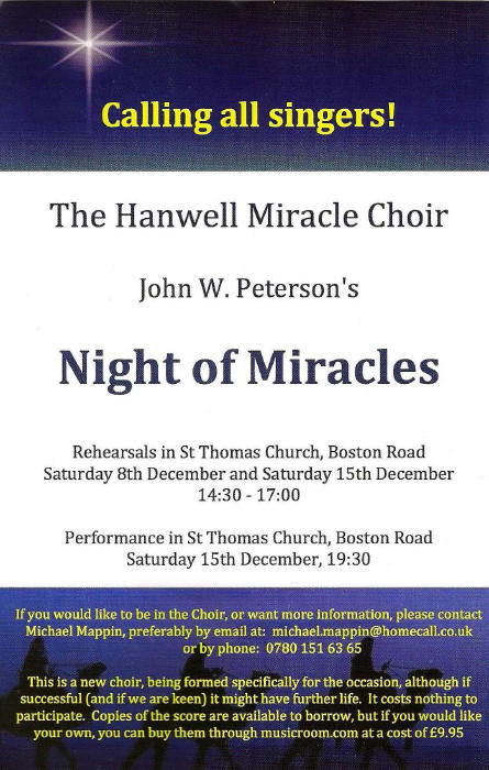 ‘Night of Miracles’on Saturday 15th December at 7:30pm In the absence of a ‘community’ choir locally, former Classic FM presenter, and now St Thomas’s organist and choirmaster, Michael Mappin decided to see if there was any benefit in putting together a ‘scratch’ choir to perform John W Peterson’s ‘Night of Miracles’. Why this particular work? “Well, it’s fairly easy to sing -possible with a couple of decent rehearsals- and it is jam packed with good tunes. “It’s a Christmas Cantata for choir, soloists, narrator and piano, dating from 1958 and, according to the composer, is the story of “a Love which knows no bounds, is limitless and absolute and was first manifested on that wonderful night so long ago...a NIGHT OF MIRACLES”. The miracle of 2012 is that so many singers (twenty eight so far but more singers are always welcome) have declared an interest in coming together for just two afternoon rehearsals to put on a performance. The mood and story told by this piece of music will be a really meaningful and appropriate start to the Christmas season.”