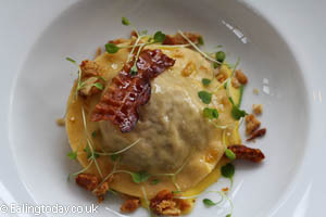 My husband described his ravioli (top right) as a delicious combination of light and creamy pasta with salty and crispy bacon.