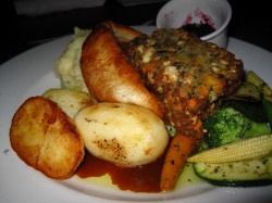 Being a non-meat eater my option was the ubiquitous nut roast. My heart sinks when I see this is the only veggie option on the menu. Having tried too many dry, tasteless ones, I wasn't excited.