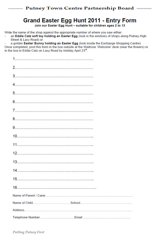 Putney Grand Easter Egg Hunt - Entry Form