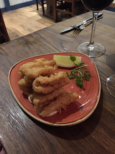 From the dinner menu, amongst the half dozen or so starters, the Smoked Bacon and Potato Scotch egg, with properly runny yolk, was declared delicious, as were the crab cakes. For me, nothing beats the calamari which have no hint of rubberiness but, having been marinated in milk and garlic and coated in a light, nicely seasoned batter, are tender and succulent.