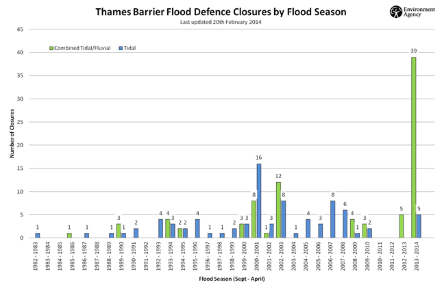 In February 2014, the Thames Barrier was closed on a record 20 occasions due to very high fluvial floods. There were 27 closures in the month, bringing the winter total to 44. Over 25% of all flood defence closures since the Thames Barrier became operational in 1982 have been during the winter of 2013/14.