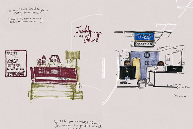 Emily’s work revolves around direct observation and discovery, and for this commission, she has been drawing staff at work across the West Mid since October 2021, producing a large quantity of drawings which capture the daily workings of the hospital, busy moments, calm moments and many friendly conversations. Emily says she has built strong connections with hospital staff and her drawings are a touchpoint in time, reflecting the diverse workforce and community spirit of staff.