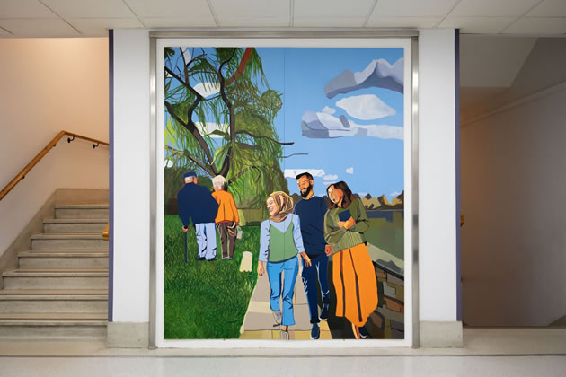 The third commission, Isleworth Riverside, is a large-scale painting by British-Nigerian artist Joy Labinjo. Located in the East Wing, it depicts staff walking through the riverside area near the hospital and was developed following conversations about the importance of connecting indoor spaces with the outdoors.