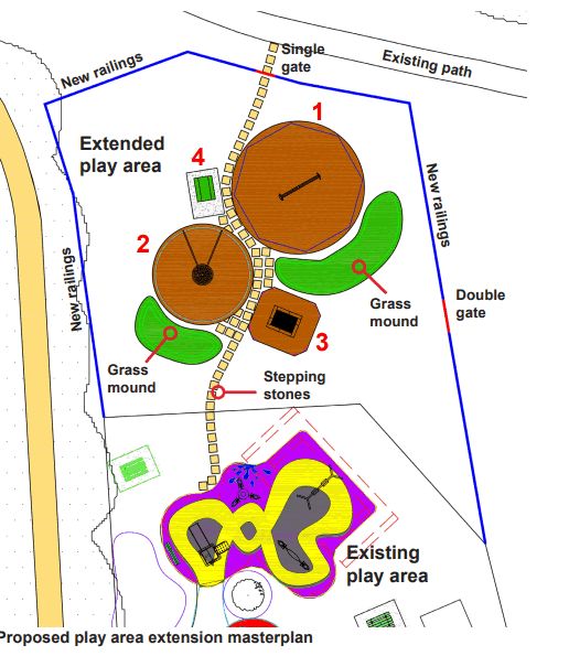 The new play space will have 3 new items of equipment and will be connected to the existing area via informal stepping stones, new grass mounds will also be created around the play area. In addition to the play items a new picnic bench and bin will also be installed.