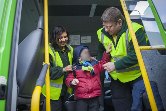 Ealing Community Transport staff help a child get off the bus. Picture: Ealing Council