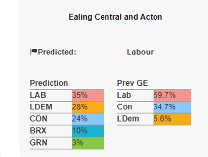 The latest polling analysis for the Ealing Central and Acton constituency is pointing to a three way contest developing for the seat.